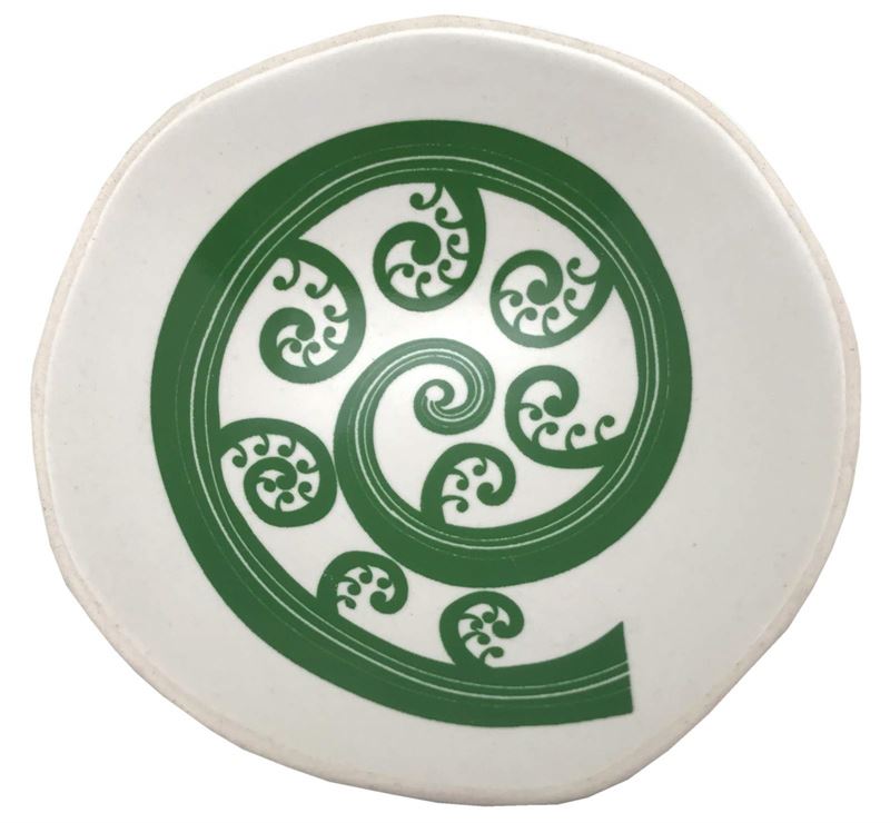 They are made of ceramic, are beautifully glazed in rich colours and feature indigenous plants and birds of New Zealand - the red Pohutukawa flower and the Koru heart, the pretty black Piwakawaka (fantail) and Tui and the green Kiwi, and fern and koru designs