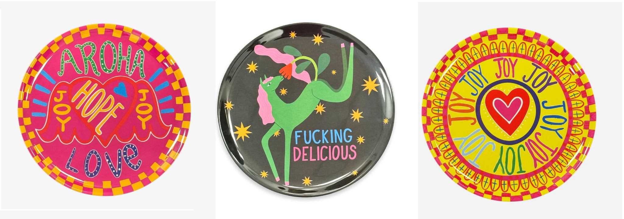 The talented Sophie Holt of Studio Soph, based in Motueka, New Zealand, has designed the Fucking Delicious tray.  She is a multi-media artist/creator and colour, bold designs and rude words often feature in her work.