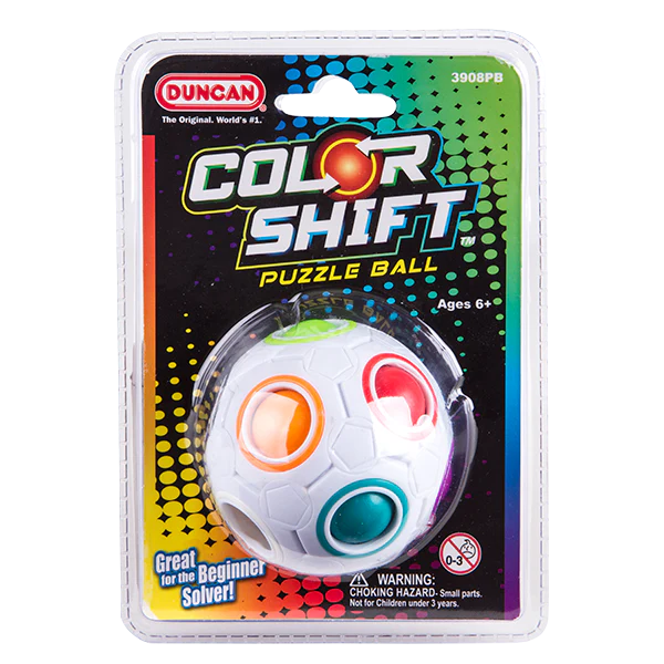 Duncan's Color Shift Puzzle ball can be solved by matching all of the colored balls with their corresponding colored rings. There are 12 holes with only 11 filled with a colored ball. Utilize the empty hole to maneuver balls around to find their matching hole.
