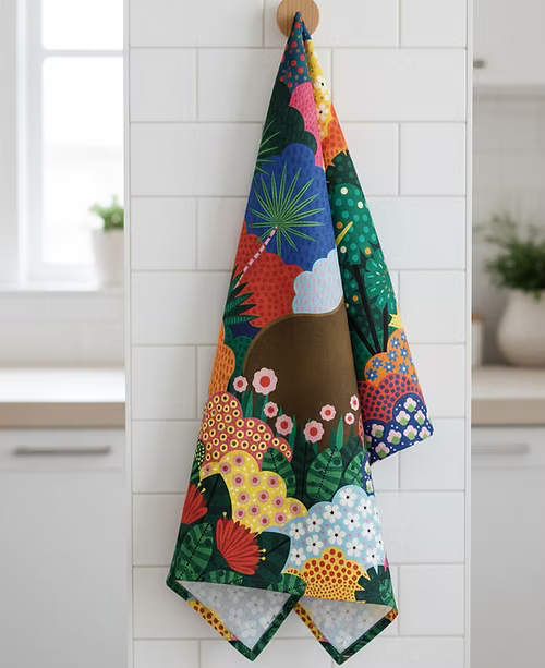 These gorgeous bright tea towels are designed by DBL, a New Zealand giftware company. They celebrate Kiwi icons and in these two designs they have placed the Kiwi and the Fantail (or Piwakawaka) in a beautiful, bright garden setting.