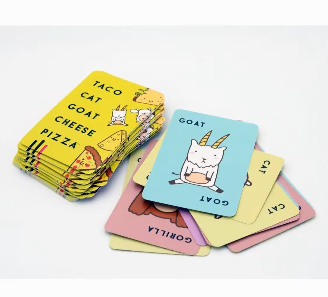 Race to slap the pile in this wild card game where Taco, Cat, Goat, Cheese, and Pizza are your magic words. Watch for matches between cards and spoken words, then compete to be fastest—the slowest player collects the cards.