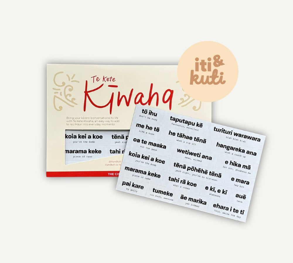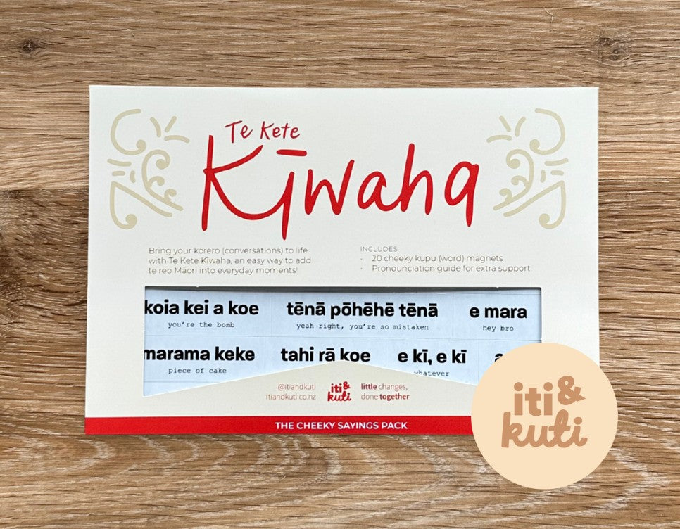 The Te Kete Kiwaha Pack or Cheeky Sayings is described as the "cheeky pack", is smaller and contains 20 magnets and a pronunciation guide. Phrases like "piece of cake', hey bro, like a boss etc. For those who want to add a bit of colour to their te Reo.